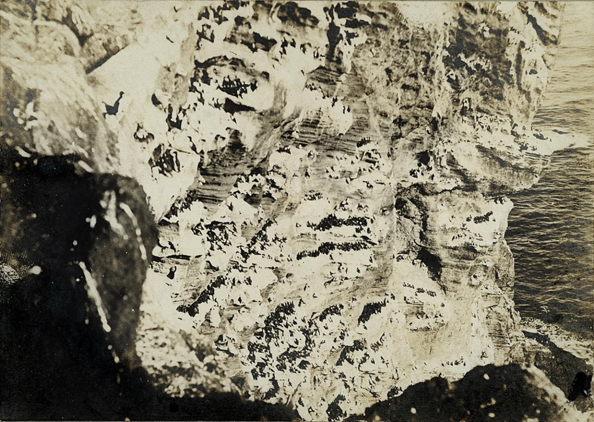 í fuglabjarg þar sem krökkt er af svartfugli. Yst t.h. sér í sjávarflötinn.