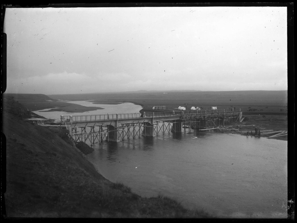 Stillansar undir brúarhöfum. Timbur og tjöld handan árinnar.