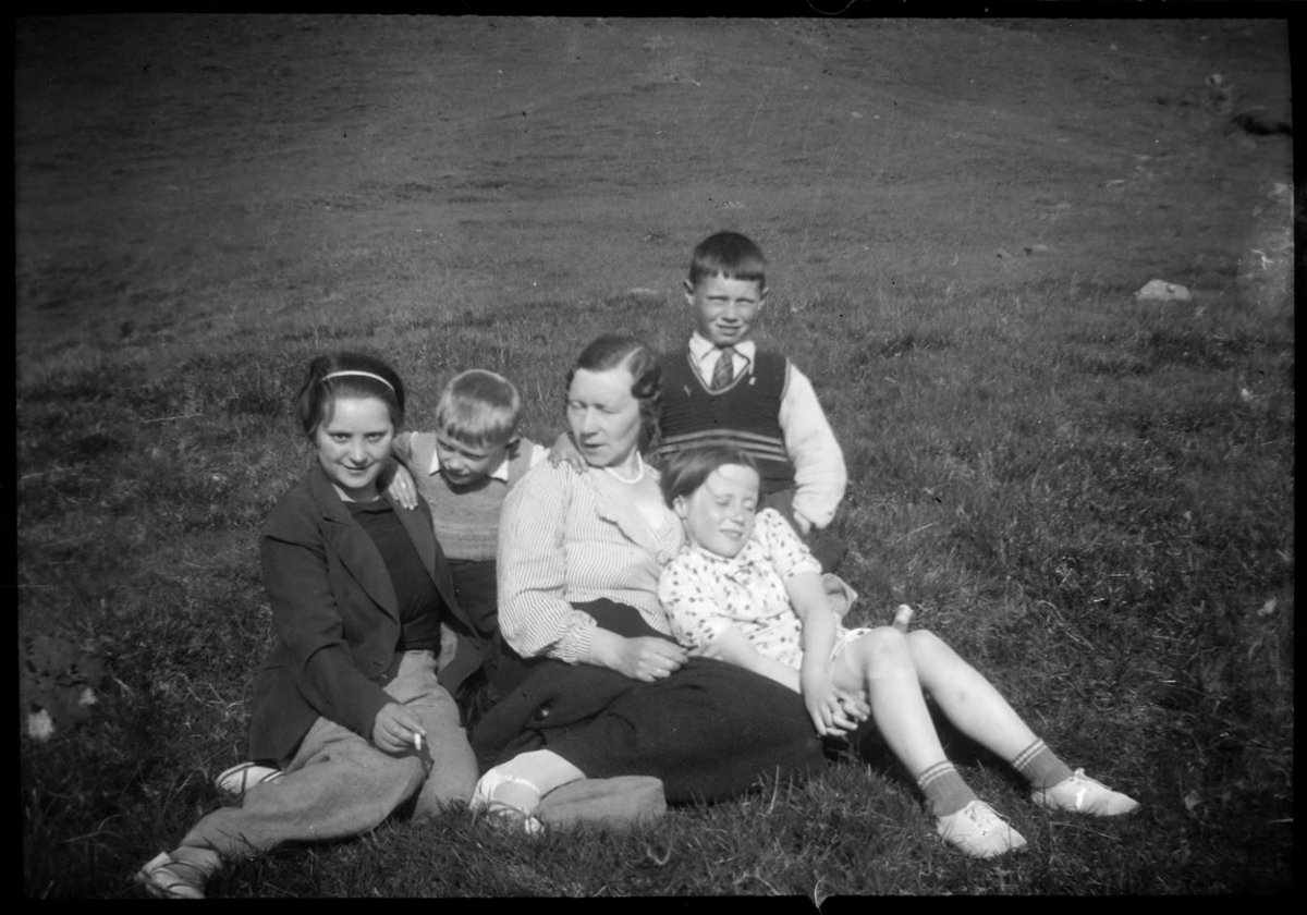 Kona og krakkar í grasi. Elín Sigurðardóttir,