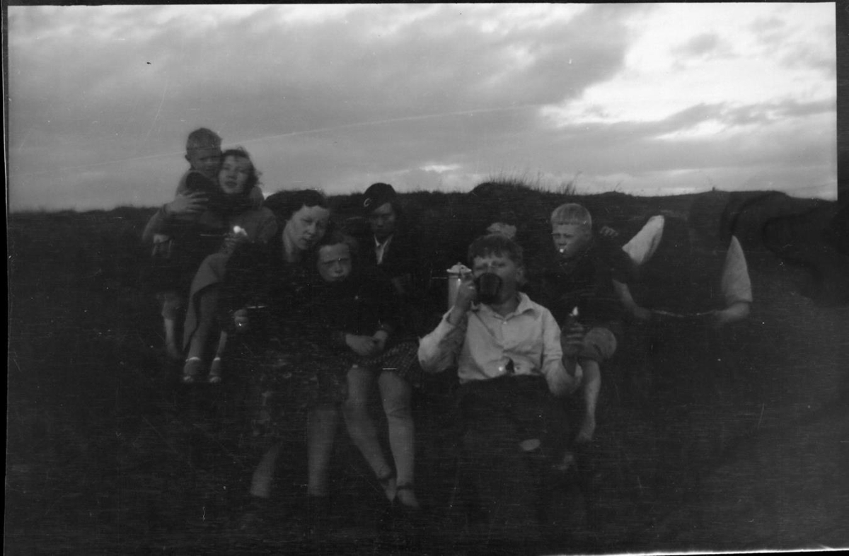 Hópur fólks situr utan í grasbala.