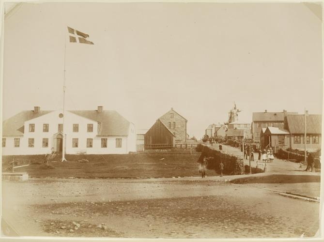 Höll landstjórans. Stjórnarráðshúsið og Bankastræti. Kornrmyllan við Bankastræti efst og yst t.h.