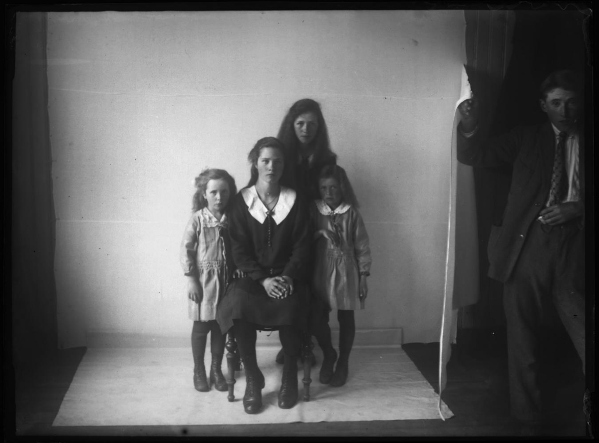 Fjórar telpur á ljósmyndastofu. Maður heldur á hvítu klæði til að lýsa betur myndina. F.v. Systurnar Helga, Ásta, Svafa og Karín Blöndal.