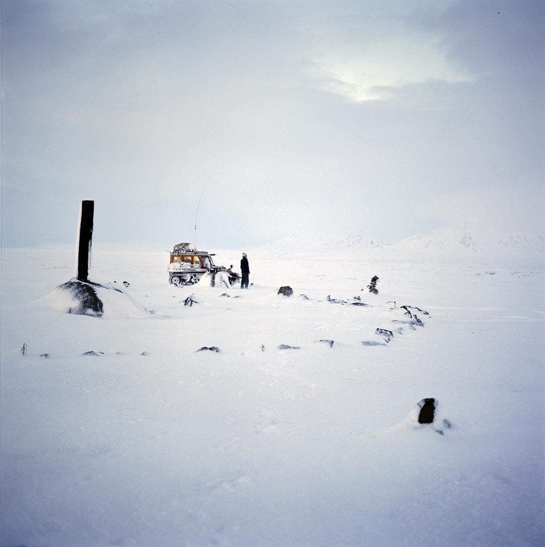bautastein á Fjórðungsöldu. Sigurjón Rist horfir til fjalla.
