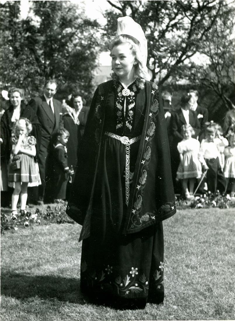 Herdís Þorvaldsdóttir sem fjallkona á 17. júní 1953. Fyrir aftan hana stendur fólk. Myndin er í grænu myndaalbúmi sem merkt er 17. júní og skátamyndir.