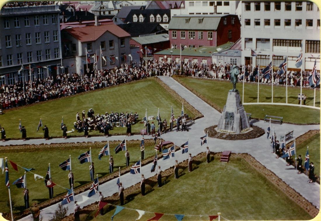 Horft yfir Austurvöll til norðvesturs. Myndin er að öllum líkindum tekin frá svölum Alþingishússins. Meðfram gangstéttinni að styttu Jóns Sigurðssonar eru karlkyns skátar sem halda á fánum. Á göngustígunum sinhvoru megin við þá eru kvennskátar sem halda á fánum. Talsverður fjöldi fólks er norðan og vestan megin á Austurvelli og þar sést húsaröðin í norðvestur horninu. Myndin er í grænu myndaalbúmi sem merkt er 17. júní og skátamyndir.