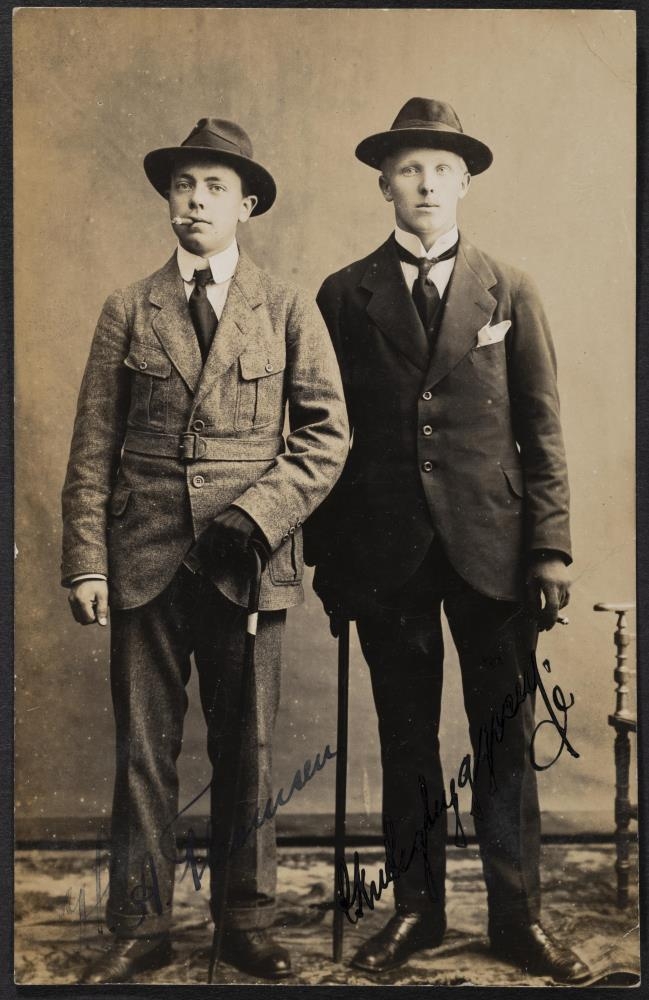 Myndin sýnir tvo unga og vel klædda karlmenn, uppstilling.
