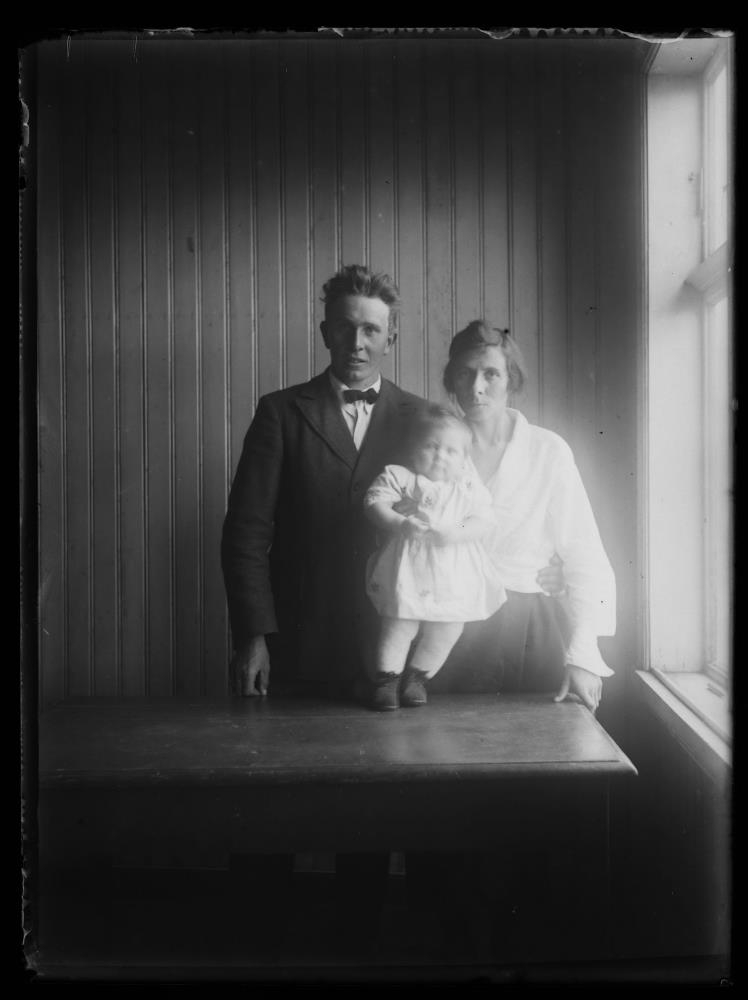 Hjón með barn við borð í panelklæddu herbergi.