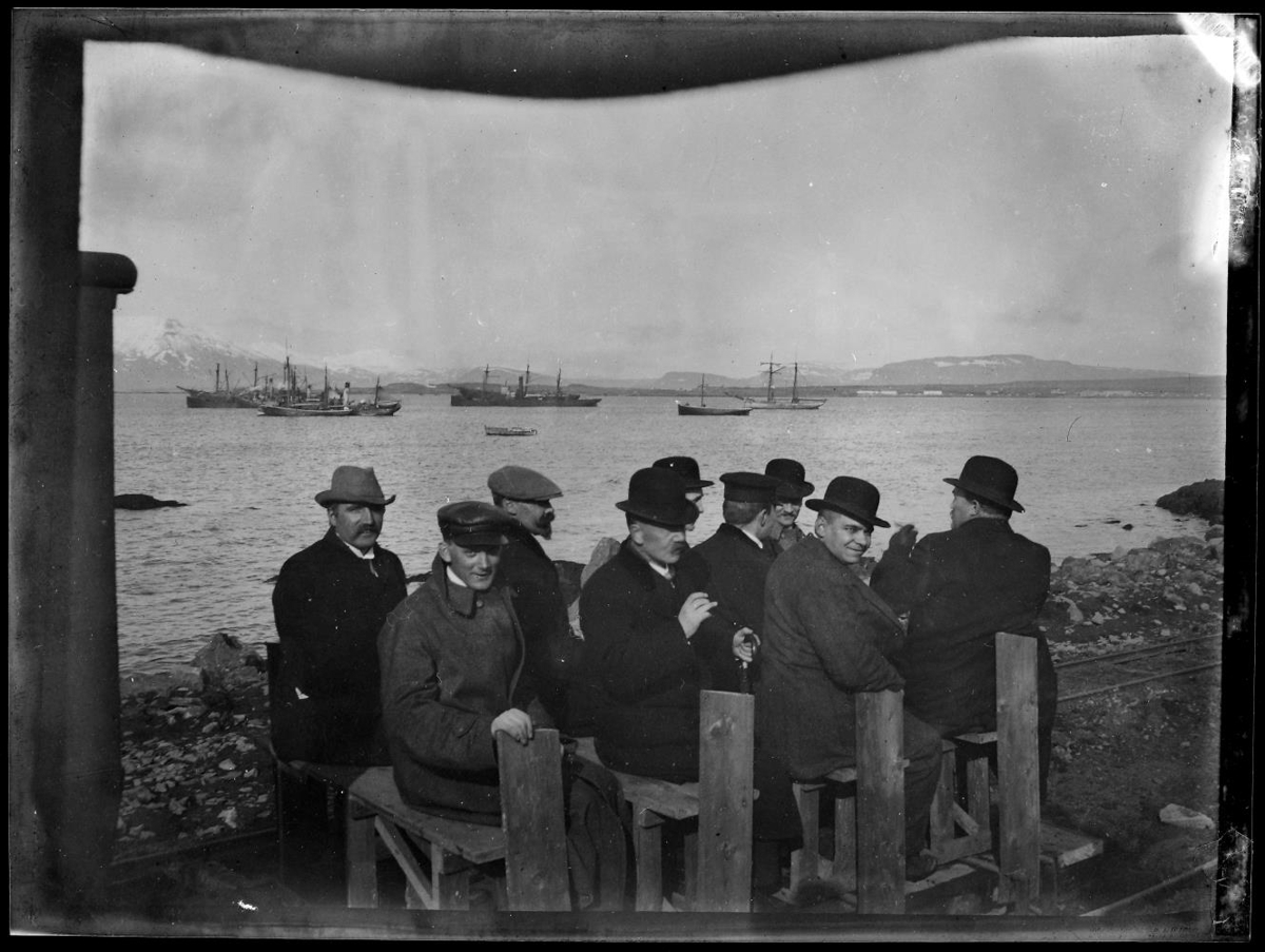 105. Reykjavíkurhöfn. Hópur spariklæddra