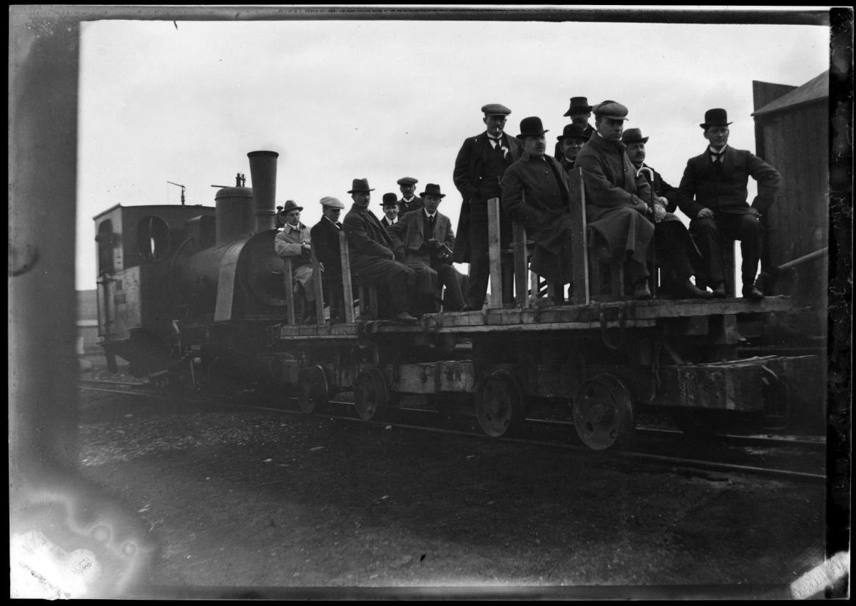 menn sitja á járnbrautarvagni. Eimreiðin í baksýn. Mennirnir eru talið