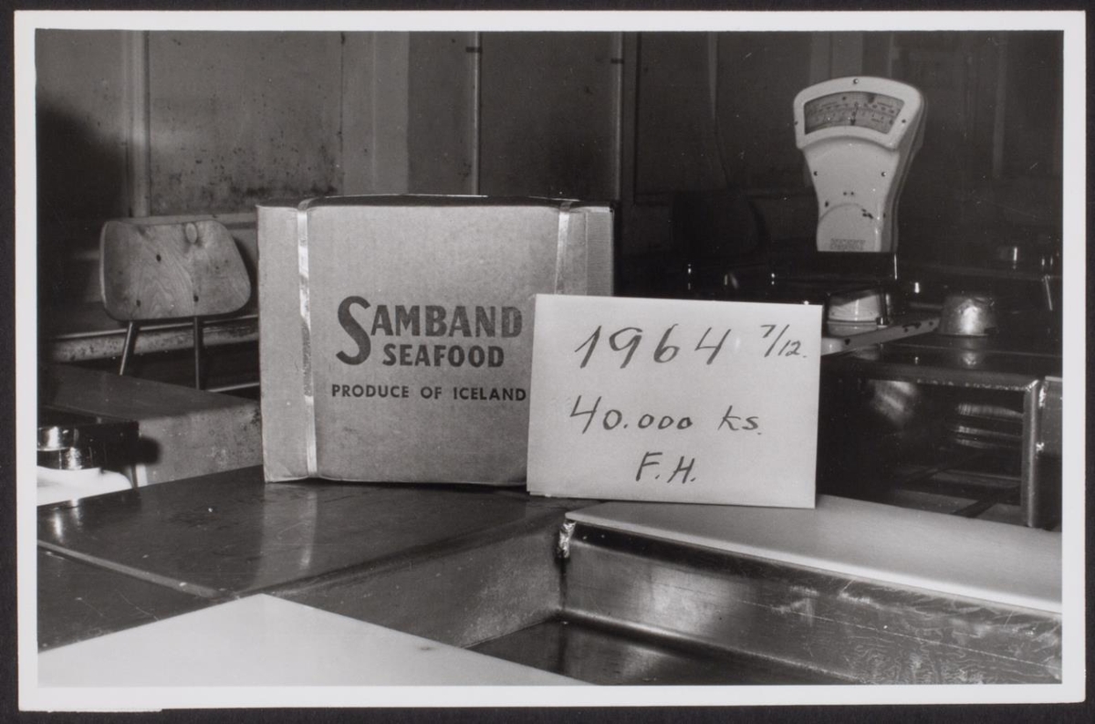 merktur Samband Seafood ásamt dagsetningu og ártali. Karlmaður stendur