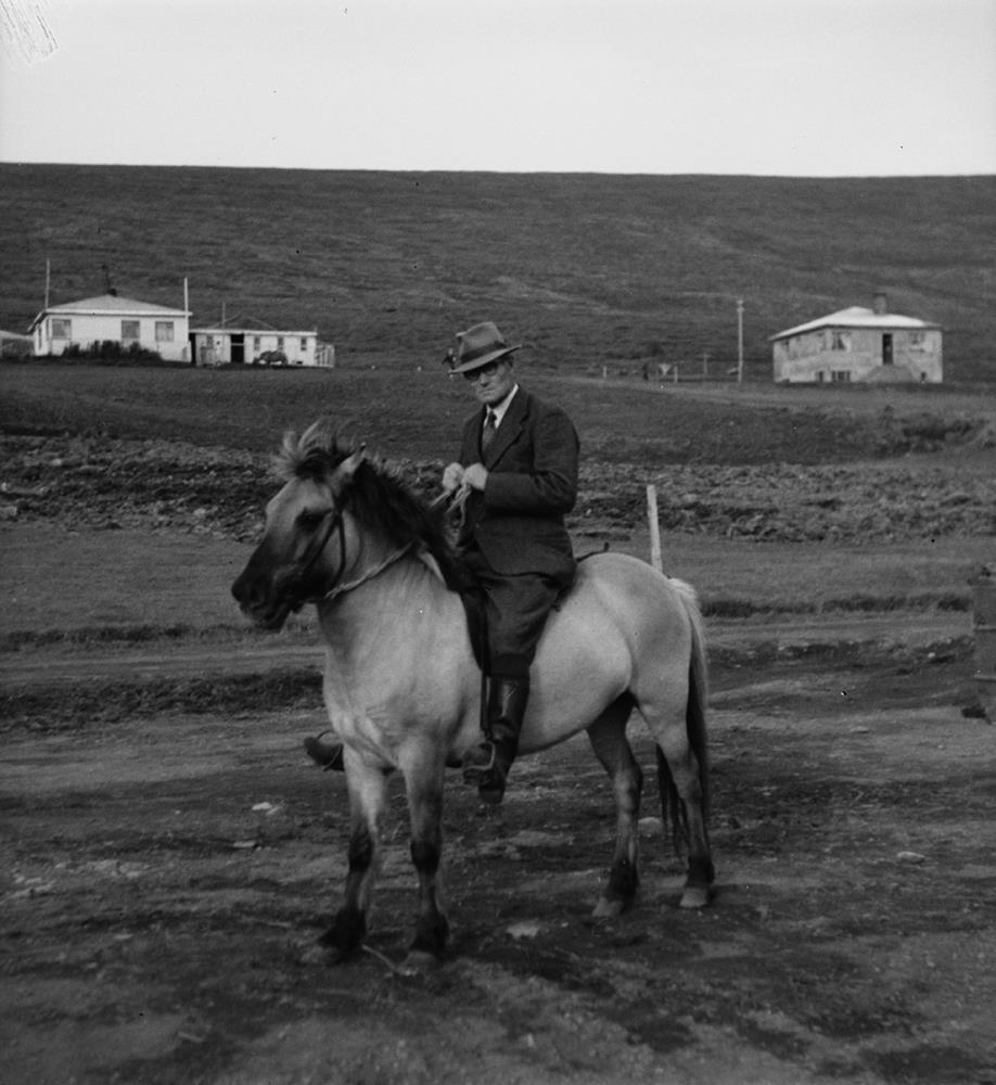 Karlmaður í jakkafötum og með hatt situr á hesti. Í baksýn eru íbúðarhús og hóll. Myndin er líklega tekin hjá heimili Kára í Staðarholti.