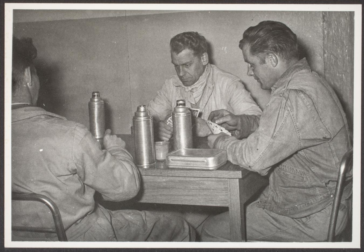 í vörugeymslu SÍS. Karlarnir spila á spil.