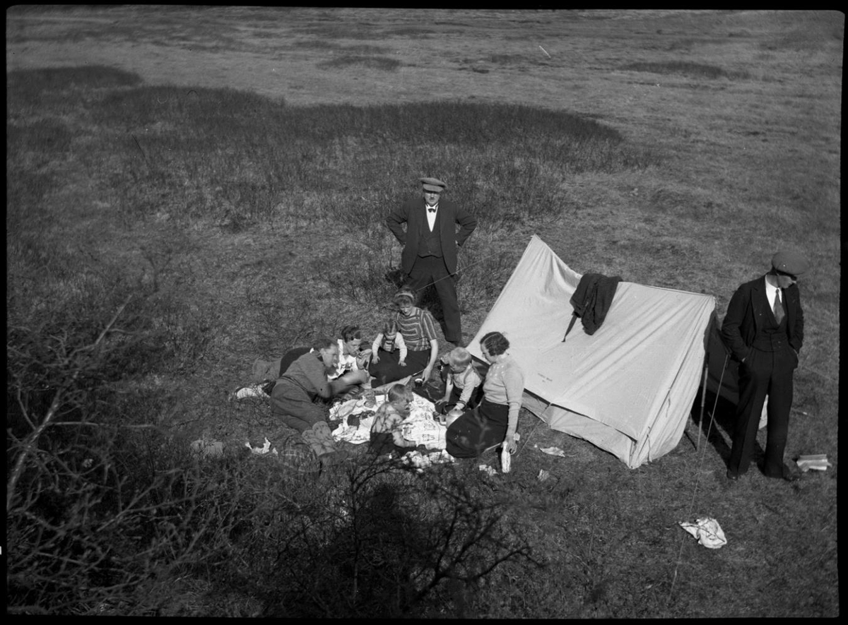 Fólk (9) að borða nesti við tjald.