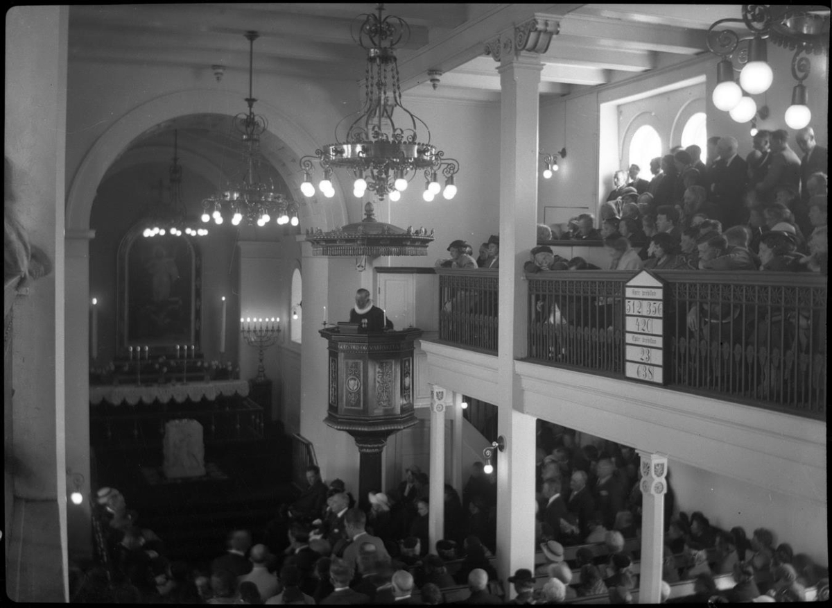Fjöldi kirkjugesta. Konungshjónin. Bjarni Jónsson í predikunarstól. Úr