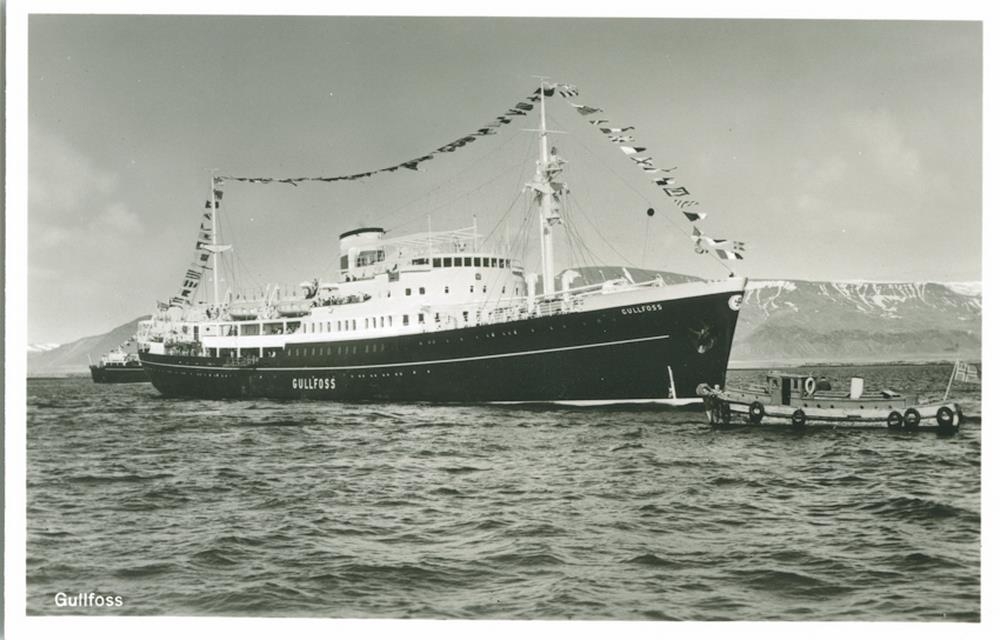 Í forgrunni er hafnsögubátur að koma til móts við farþegaskip, nýtt að sjá. Á hlið þess og kinnung er nafnið GULLFOSS. Fánalína er strengd stafna á milli. Í baksýn t.v. grillir í annað skip og í bakgrunni er fjall.