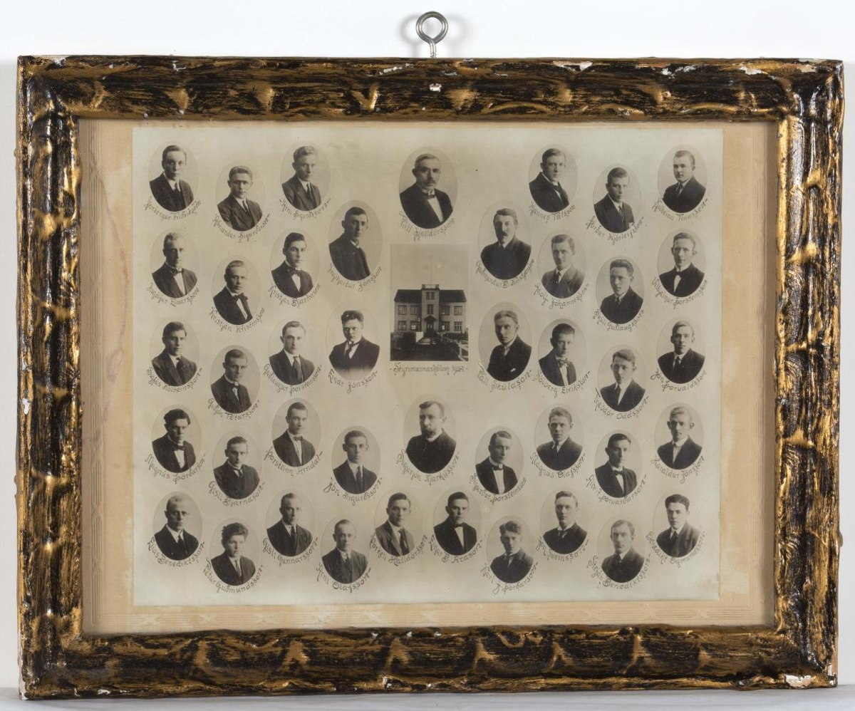 Innrömmuð ljósmynd af árgangi 1922 - 1923 í Stýrimannaskólanum í Reykjavík (við Stýrimannastíg), skólastjóri Páll Halldórsson. Á mynd þessari eru margir Hafnfirðingar, þar á meðal Benedikt Ögmundsson, sonur Ögmundar skólastjóra í Flensborg, Árni og Ásmundur Sigurðssynir frá Ási og skólastjórinn Páll Halldórsson. Guðjón Pétursson er annar frá vinstri í miðröð.