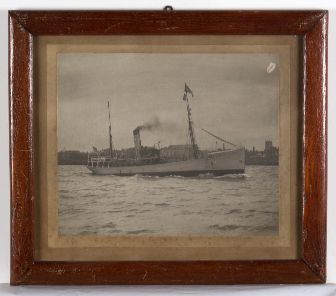 Innrömmuð ljósmynd af togaranum Ingólfi Arnarsyni RE. Myndin er mjög gömul og farin að gulna. Gefandi Guðmundur Guðmundsson, Álfhólsvegi 71, Kópavogi. Faðir gefanda var skipverji á Ingólfi Arnarsyni.