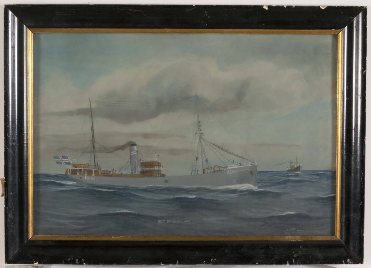 Innrömmuð vatnslitamynd af togaranum Skallagrími RE 145. Höfundur ELS JON, Hull, og er myndin því máluð í erlendri höfn.