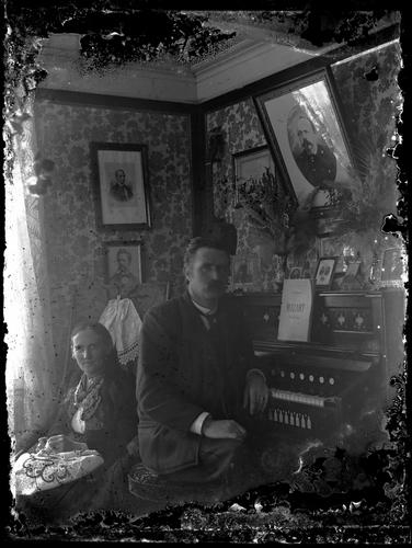 Bjarni situr við orgel en Sigríður er með útsaum á milli handa. Innrammaðar