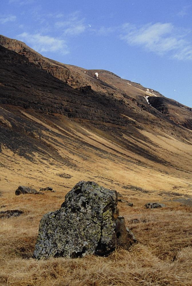 en í baksýn er há fjallshlíð með hamrabeltum.