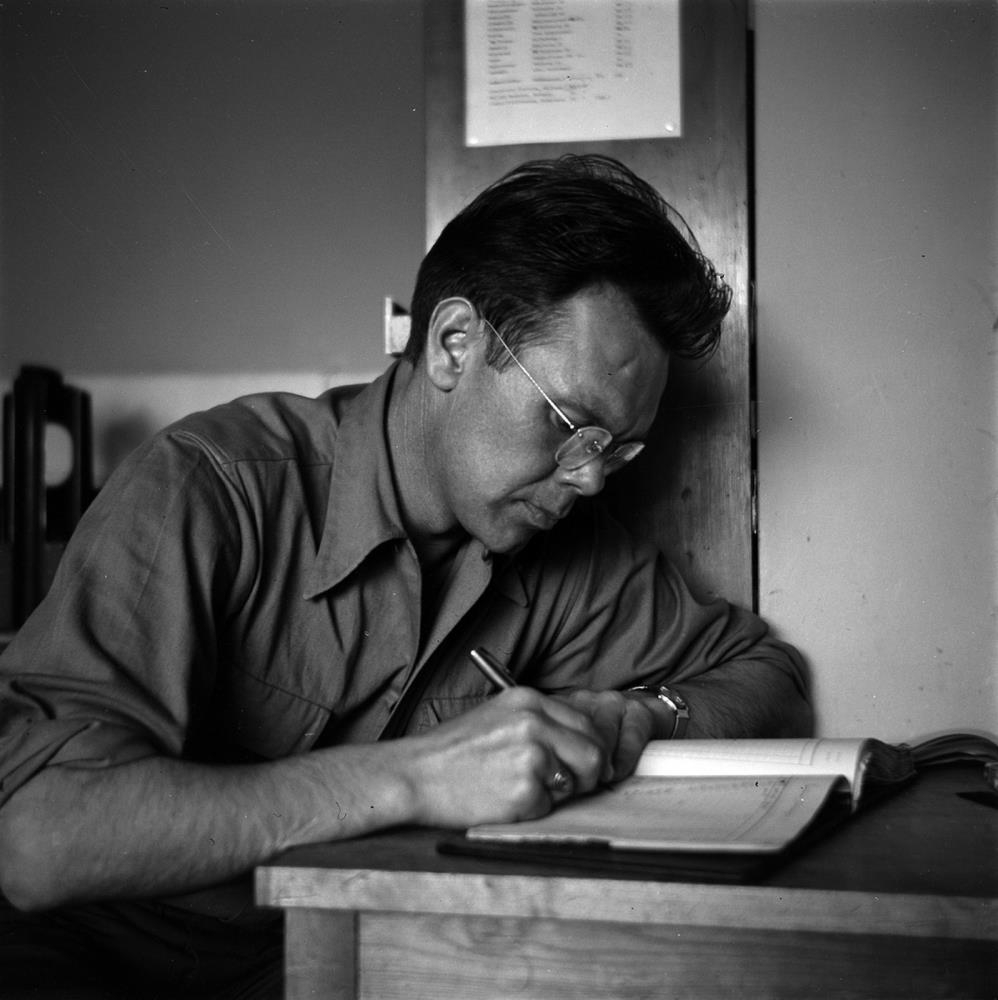 Karlmaður situr við skrifborð og skrifar í bók í prentsmiðju Þjóðviljans. Hann er klæddur skyrtu með uppbrettar ermar og er með gleraugu. Mögulega Eiður Bergmann Helgason (1915-1999), gjaldkeri Þjóðviljans og síðar framkvæmdarstjóri blaðsins.