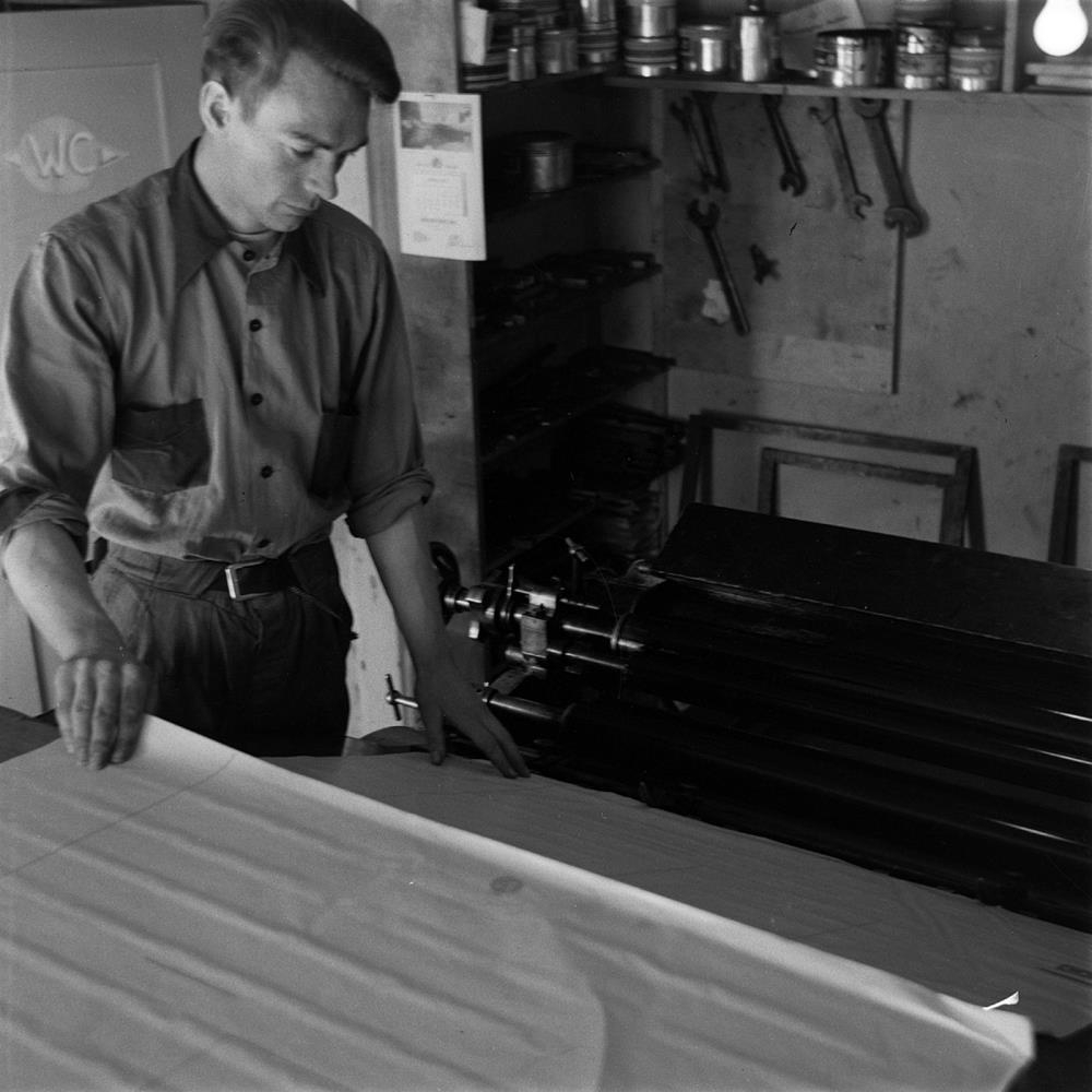 Karlmaður stendur við prentvél í prentsmiðju Þjóðviljans. Hann er klæddur í tvílita skyrtu. Fyrir aftan hann er merki fyrir „WC“. Skiptilyklar hanga á vegg til hægri.