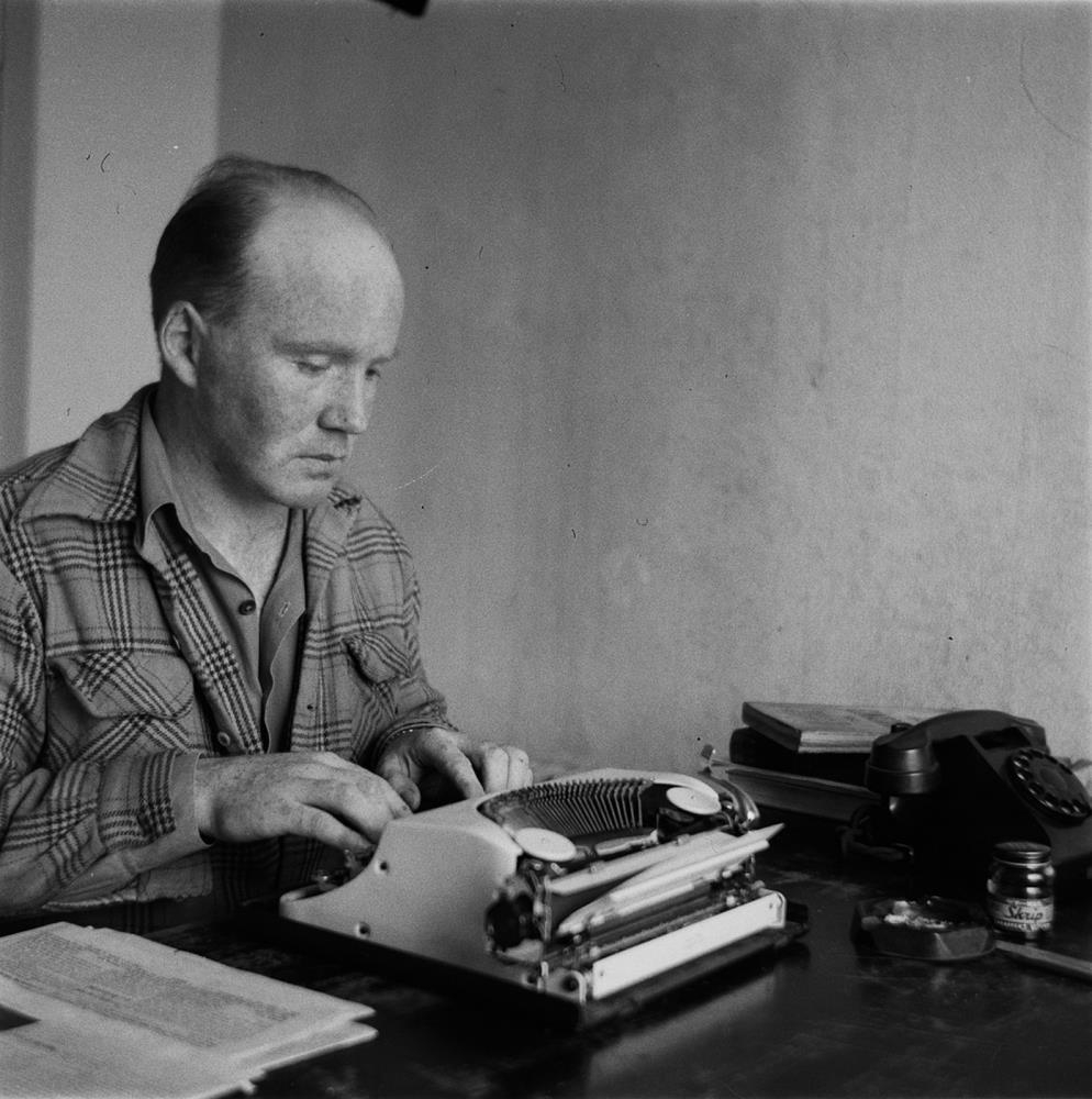 Eldri karlmaður situr við ritvél í prentsmiðju Þjóðviljans. Hann er klæddur köflóttri skyrtu yfir aðra skyrtu. Á skrifborðinu er sími, bækur og krukka. Sennilega Bjarni Sólmundur Benediktsson frá Hofteigi, blaðamaður.