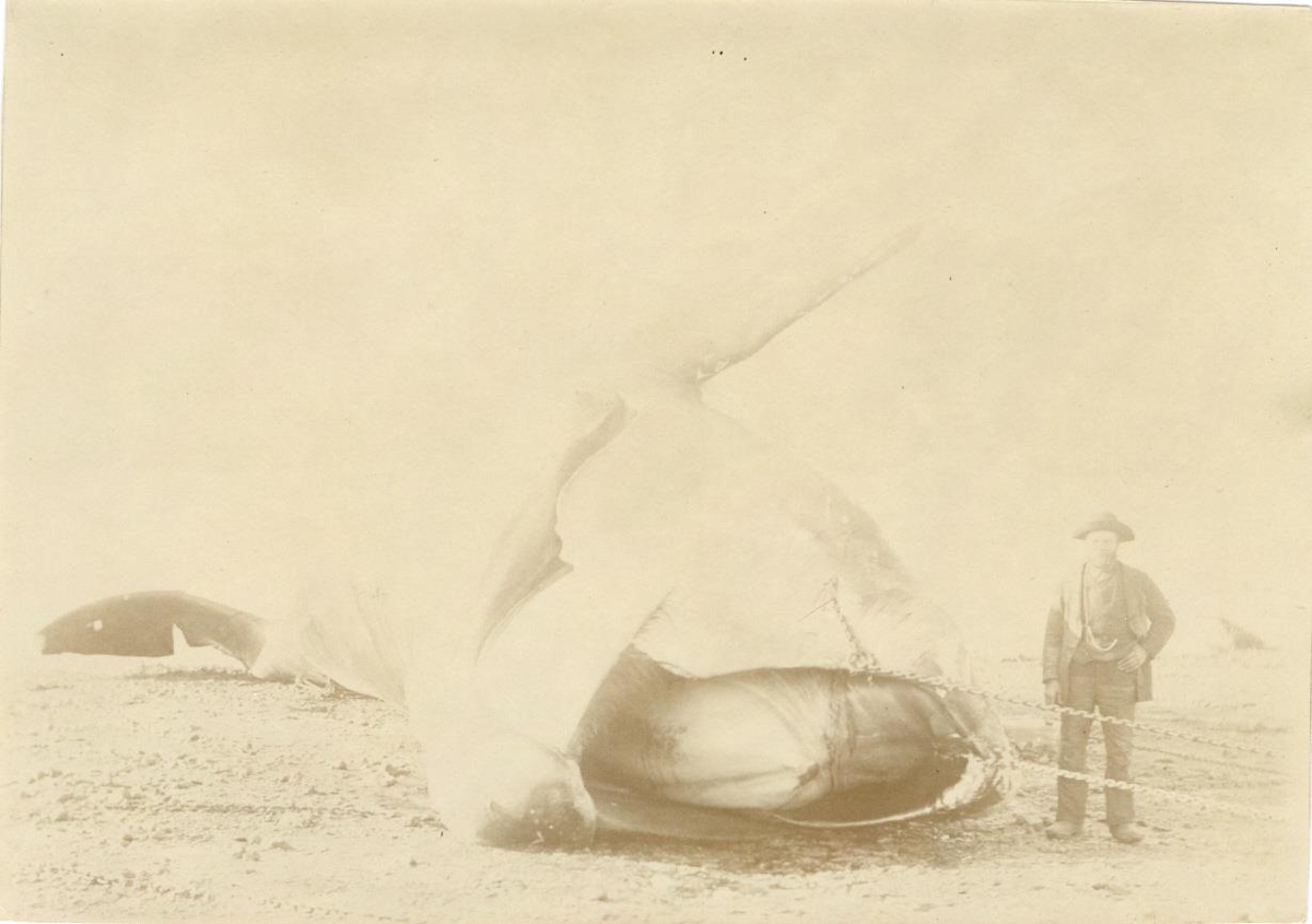 Maður stendur við hlið hvals í fjöru. Sléttbakur. Aftan á myndina er skrifað með blýanti: Nordkaper (set forfra).