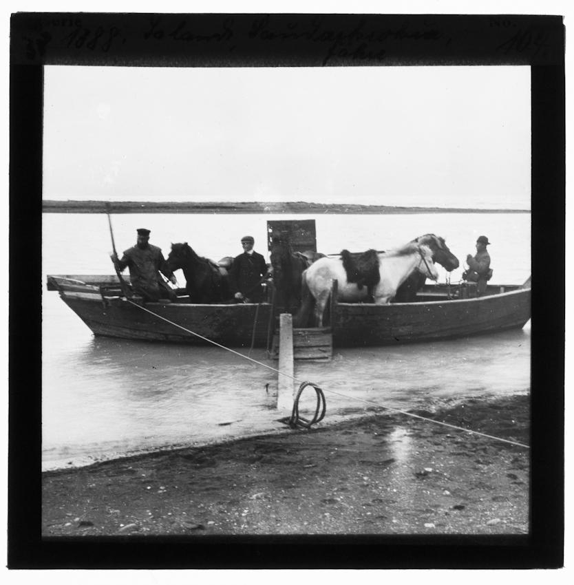 38. Dragferja á Vesturósi Héraðsvatna. Bátur sem hægt er að opna og leggja niður hlera á hvorri hlið við árbakka. Fjórir hestar og tveir menn auk ferjumanns, sem er í stafni bátsins, eru um borð. Planki liggur frá bátnum í land og taumur er festur í færarúllu á borðstokk bátsins. „Sauðárkróksferjan“ stendur á sjálfri skyggnunni. Samkvæmt Sögu Sauðárkróks. Fyrri hluti eftir Kristmund Bjarnason er Jón Ósmann (1862-1914) ferjumaður til vinstri við spilið sem notað var til að draga ferjuna á milli árbakka.