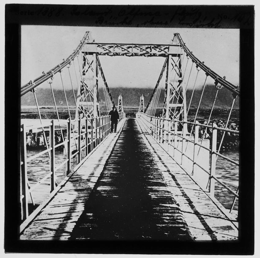 4. Ölfusárbrúin. Horft eftir hengibrú. Maður á miðri brú.