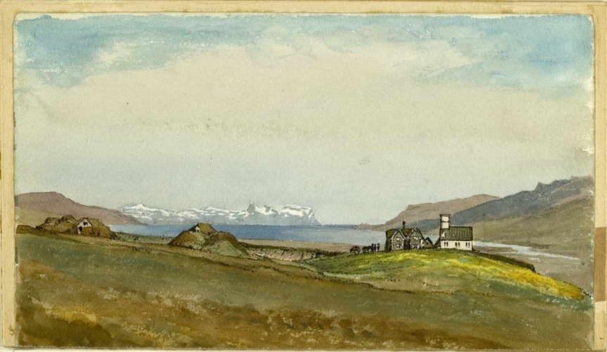 bær og útihús í forgrunni. 2 hestar og 3 menn á hlaði. Handan bæjar sér