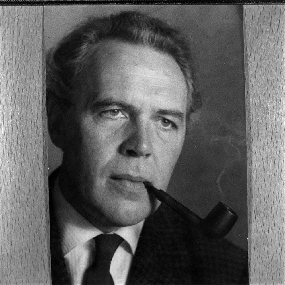 Karlmaður í jakkafötum með bindi situr fyrir á mynd. Hann reykir pípu.