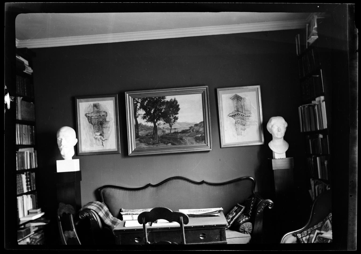 úr bókaherbergi. Sófi fyrir miðju og bókahillur til beggja handa. Milli