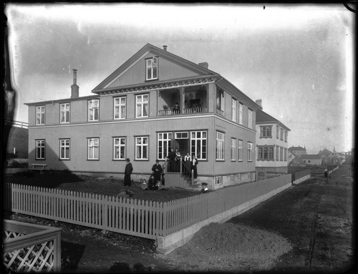 Timburhús, girðing allt um kring. Byggð í bakgrunni. Gata. Ljósastaur. Fólk úti á tröppum hússins, karlar, konur og börn.