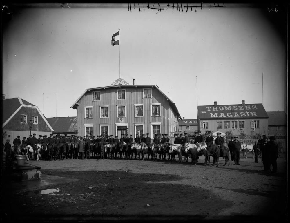 Stór hópur af skipverjum í einkennisbúningum á hestum. Í baksýn eru timburhús. Fáni blaktir á einu þeirra. Á bakvið hópinn má sjá ljósastaur og garð með trjám. Beggja vegna hópsins má sjá í, til vinstri,vatnspóst og álfötur, en hægra megin hestakerru. Þekkja má þýska konsúlinn standani hjá hópnum.