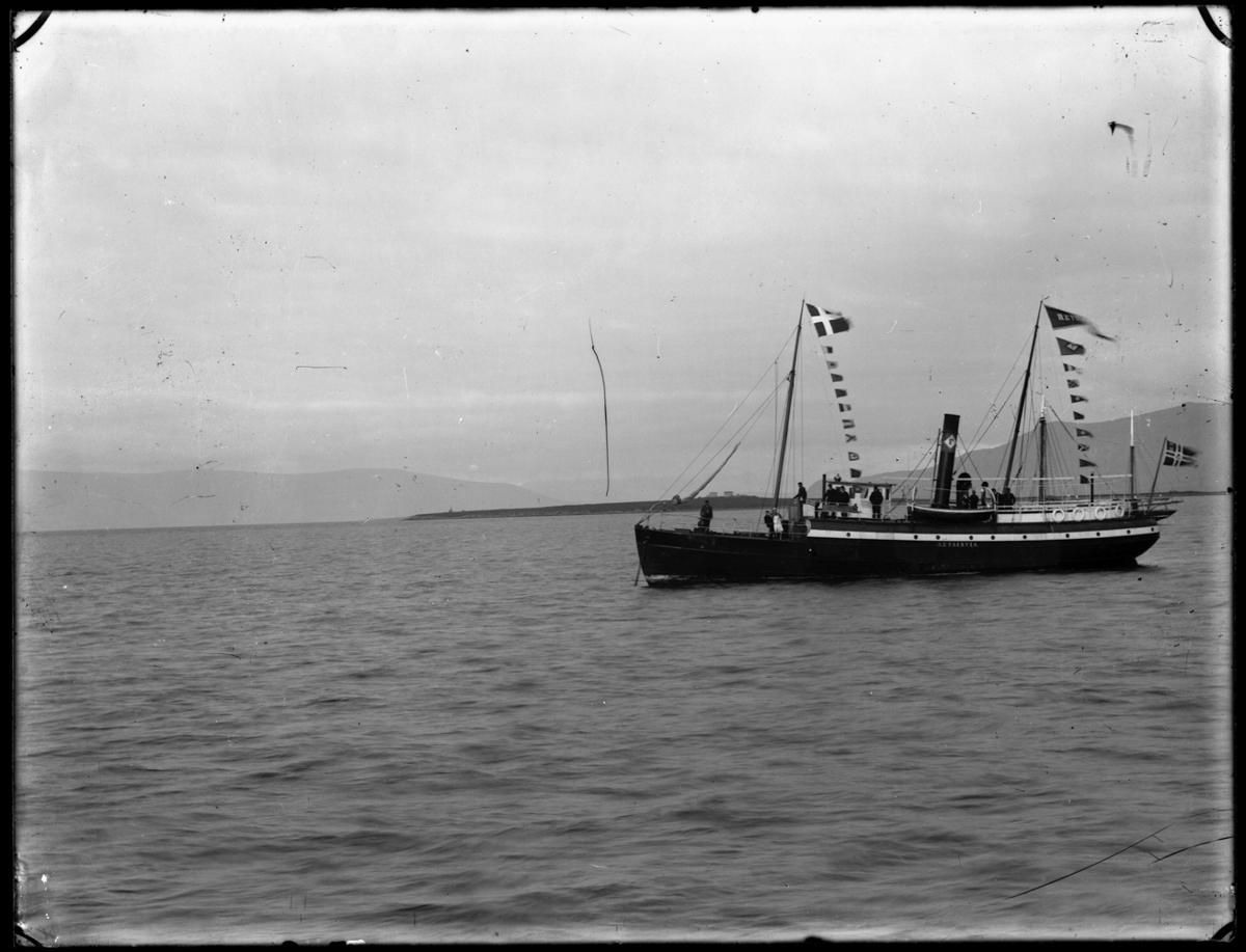 Skip á legunni. Skipsáhöfnin uppi við fyrir myndatökuna. Fánar og flögg. Eyja í baksýn. Einnig fjöll.