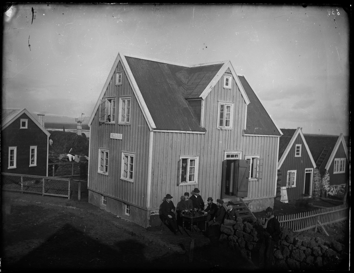 Á myndinni eru tvö timburhús og torfbær. Fyrir framan annað húsanna sitja nokkrir karlmenn við borð með drykkjarföng fyrir framan sig. Einn þeirra reykir pípu. Annar vindil. Tveir menn eru í glugga og barn er í glugga uppi. Fyrir framan og aftan húsið eru girðingar, hlaðnar og úr timbri. Einnig er vírnet notað í girðinguna fyrir aftan húsið. Þvottur á snúrum að húsabaki. Gistihúsið Ingólfur og hús Þórdísar Símonardóttur til vinstri..
