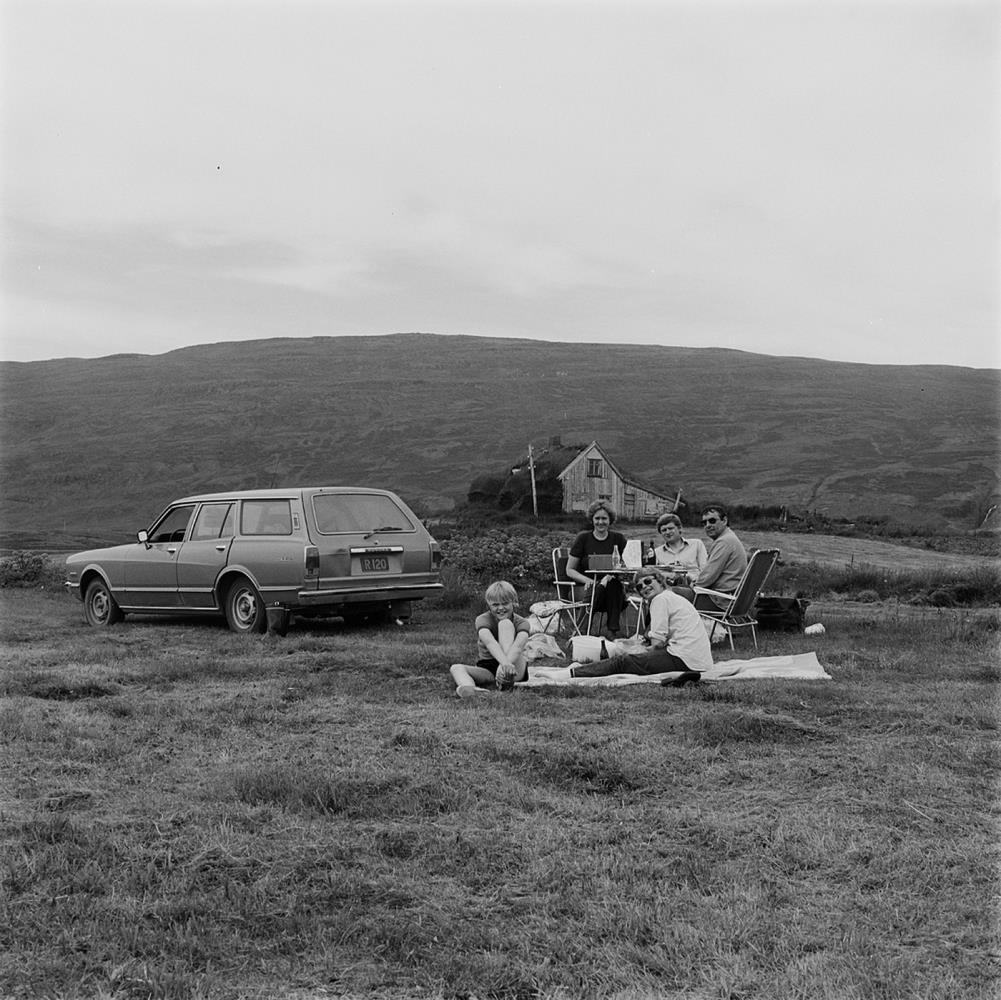 Setið að snæðingi í túninu á Kjarlaksstöðum. Harpa, Þórður, Margrét Ingólfsd., Maja, Þór, Knútur.