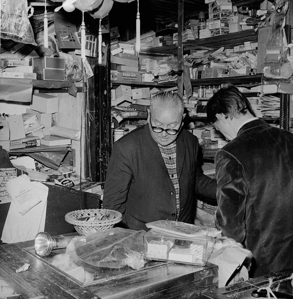 í krambúð og bakvið það standa tveir karlmenn, annar vel yfir miðjan aldur