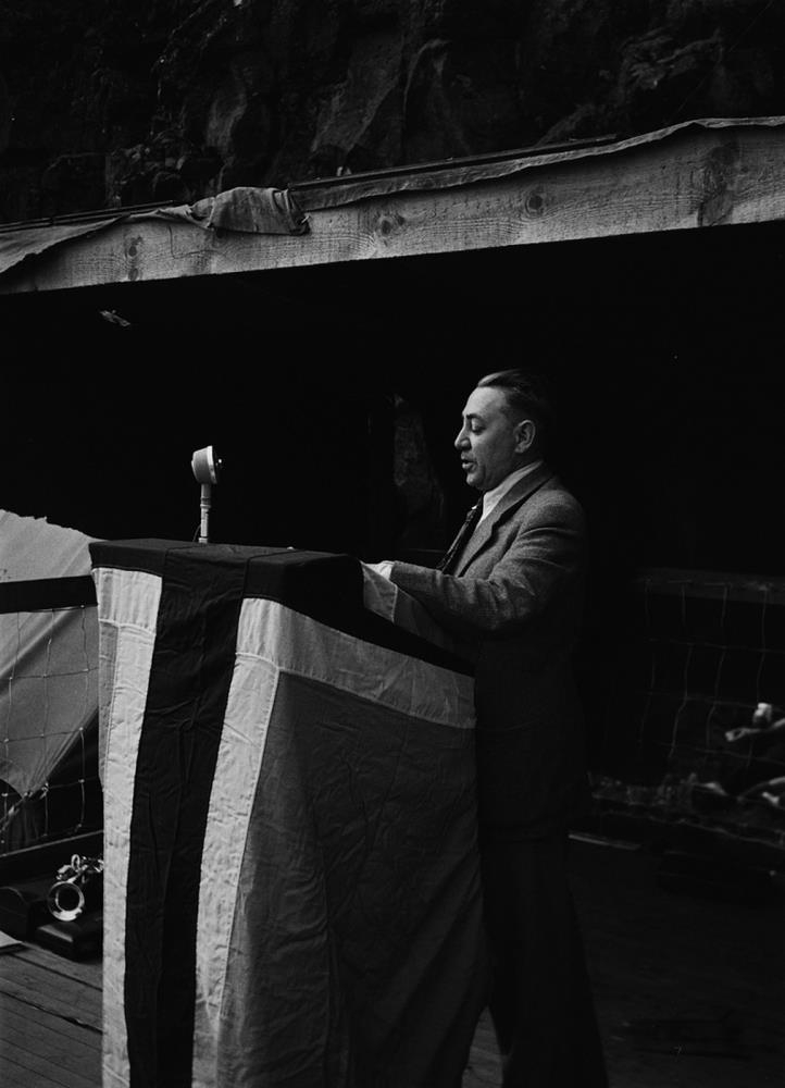 Jónsmessumót Sósíalistaþings á Þingvöllum. Óþekktur karlmaður stendur við ræðupúlt sem er vafinn íslenska fánanum. Sennilega Kristinn E. Andrésson, alþingismaður.