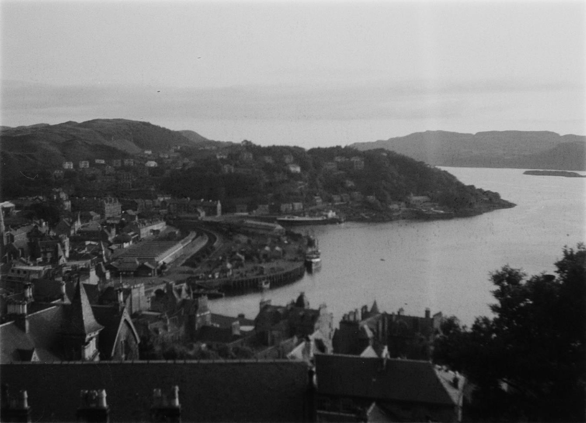 Skotlandsferð 1951. Horft er yfir borg og vatn í Skotlandi. Hólar og fjöll í baksýn.