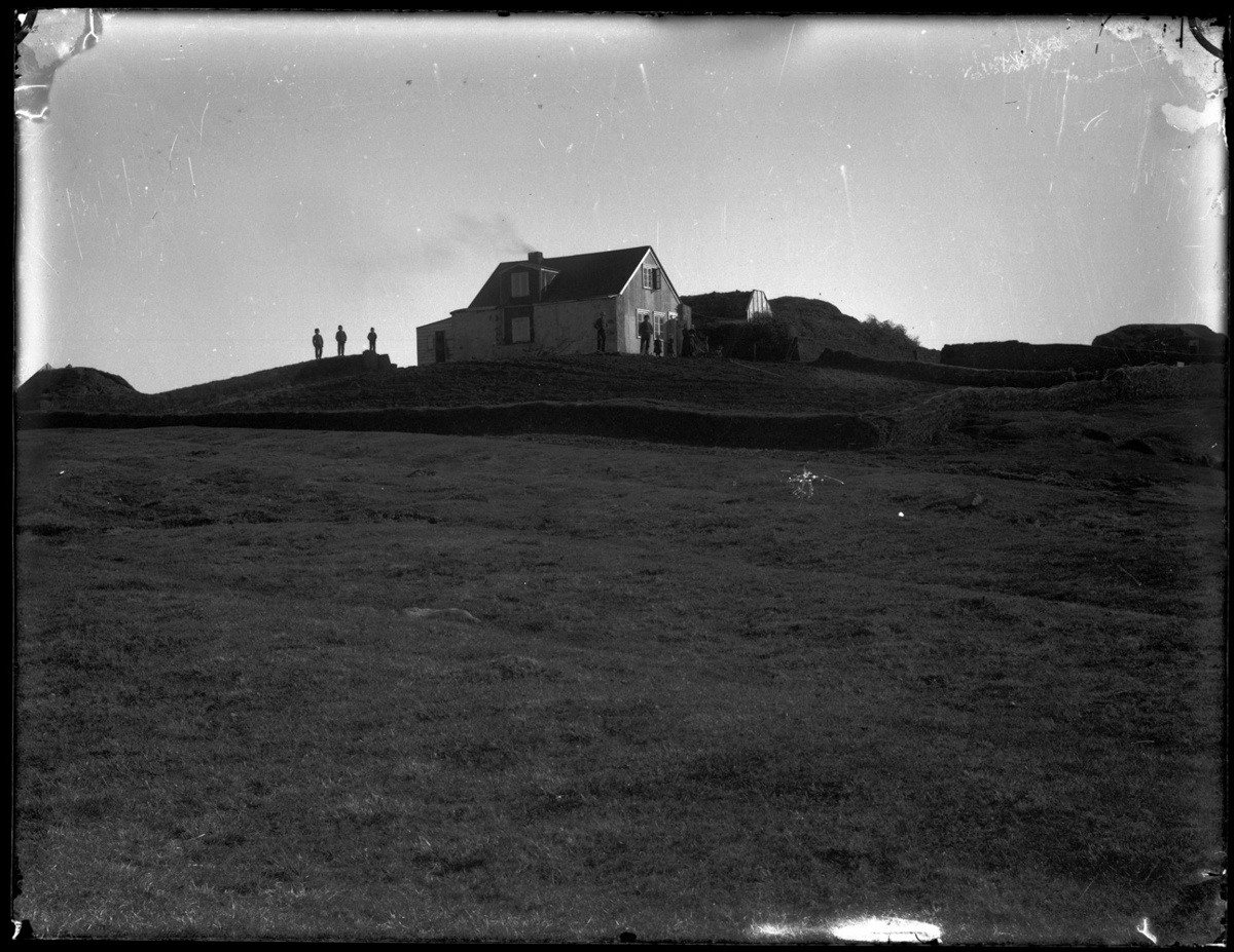 „Valbjarnarvellir undir aldamótin 1900. Á þeim tíma bjuggu þar hjónin Sesselja Þorbjörg Jónsdóttir frá Eskiholti (1861-1917) og Jón Guðmundsson frá Stangarholti (1850-1926). Báðir bæir tilheyra Borgarhreppi í Mýrasýslu, eins og Valbjarnarvellir. Börn Sesselju og Jóns voru alls tíu og nöfn þeirra og fæðingarár þessi: Jón 1882, Jón Júlíus 1883, Guðmundur 1885, Guðmundur Jóhann 1887, Guðrún 1888, Rósa 1890, Kristófer 1893, tvíburarnir Valbjörg og Valbjörn 1895 og yngstur var Leifur fæddur 1901. Lengst til vinstri á myndinni má sjá elstu synina og lengst til hægri er Sesselja með yngstu börnin, Jón bóndi stendur vinstra megin við þau. Þessi bær brann 1934, þá var annar byggður á sama stað og stendur hann enn uppi þegar þetta er skrifað (2021).“ (GJ 2021)