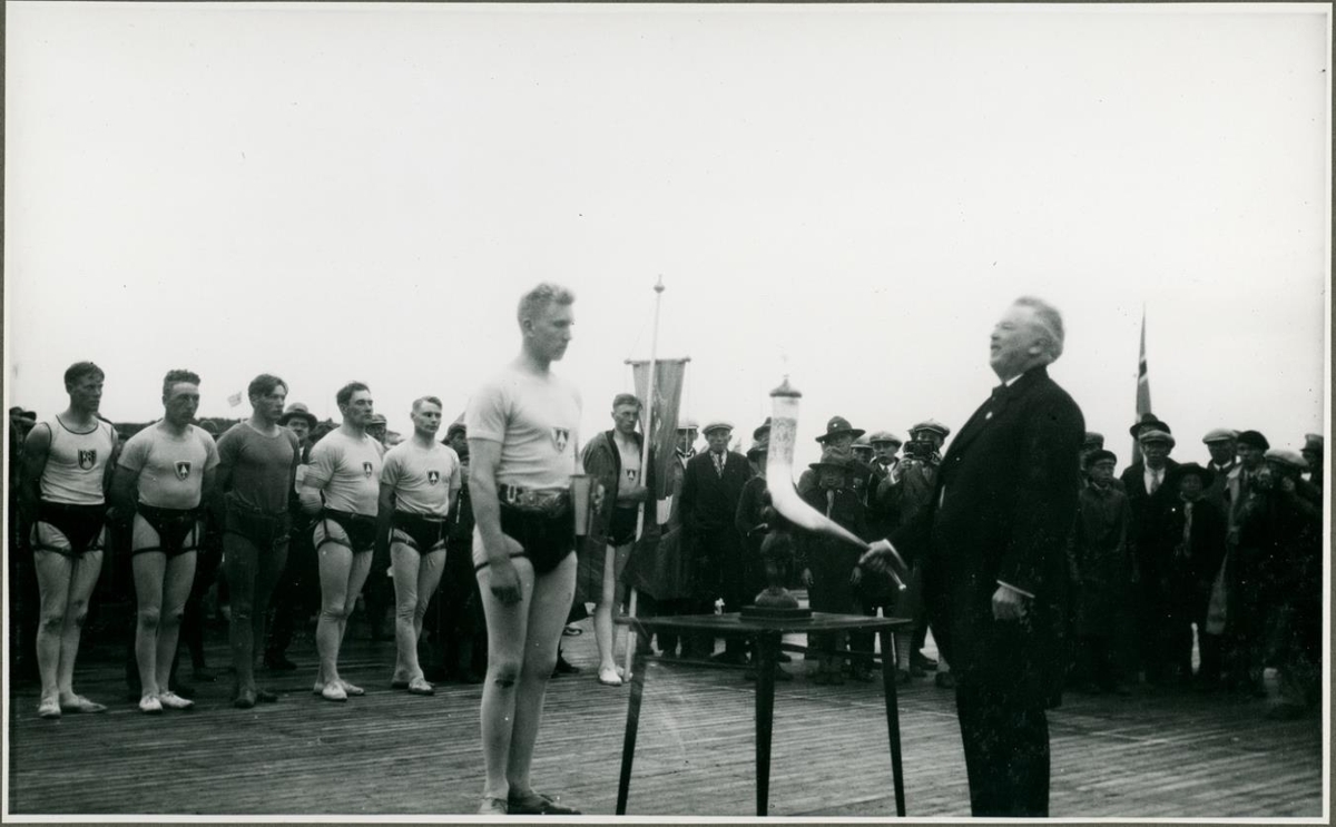 Alþingishátíðin 1930. Þingvellir, Bláskógabyggð. Glímumenn. Verðlaunaafhending á útskornu horni. Mannfjöldi fylgist með.