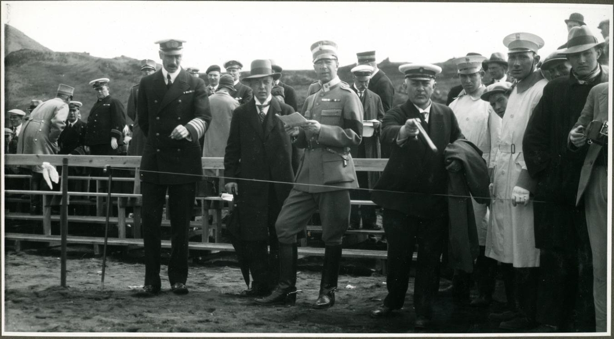 Alþingishátíðin 1930. Þingvellir, Bláskógabyggð. Menn, prúðbúnir, við girðingu. Fólk í baksýn.