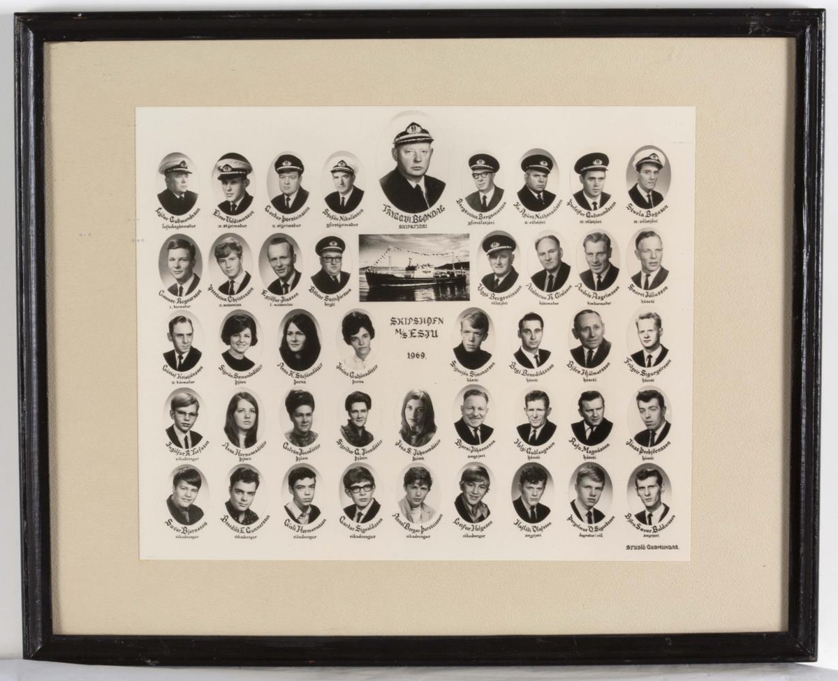 Innrömmuð ljósmynd af skipverjum á strandferðaskipinu Esju (II), sem Ríkisskip gerði út frá 1939-1969.