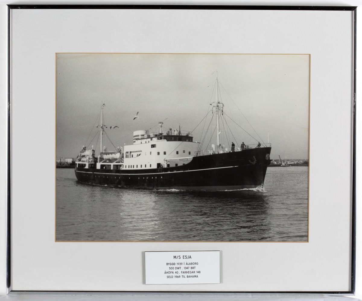 Ljósmynd af Esju (II), sem Ríkisskip gerði út frá 1939-1969. Hvítt skilti með áletrun er límt á glerið. Myndin var á gangi á skrifstofu Ríkisskipa.