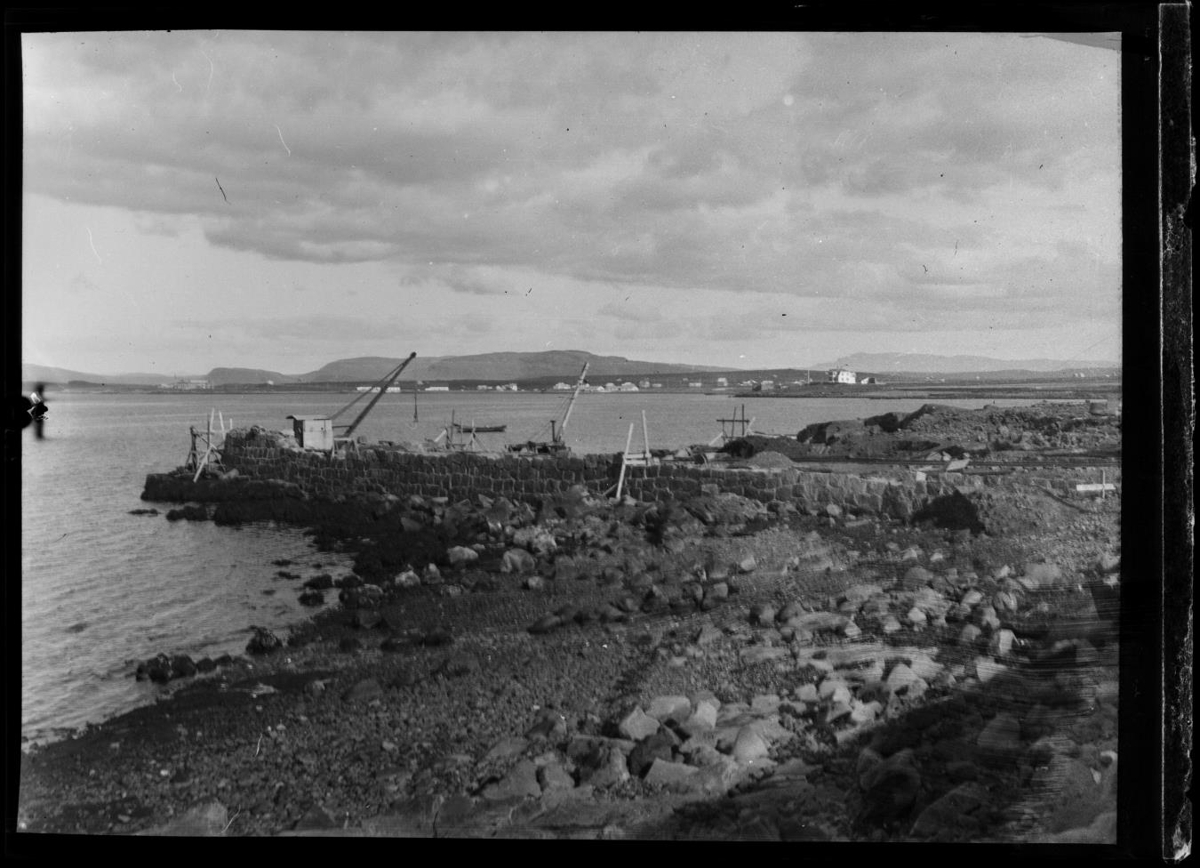 yfir framkvæmdir við upphleðslu hafnargarðs. Kranar. Í fjarska