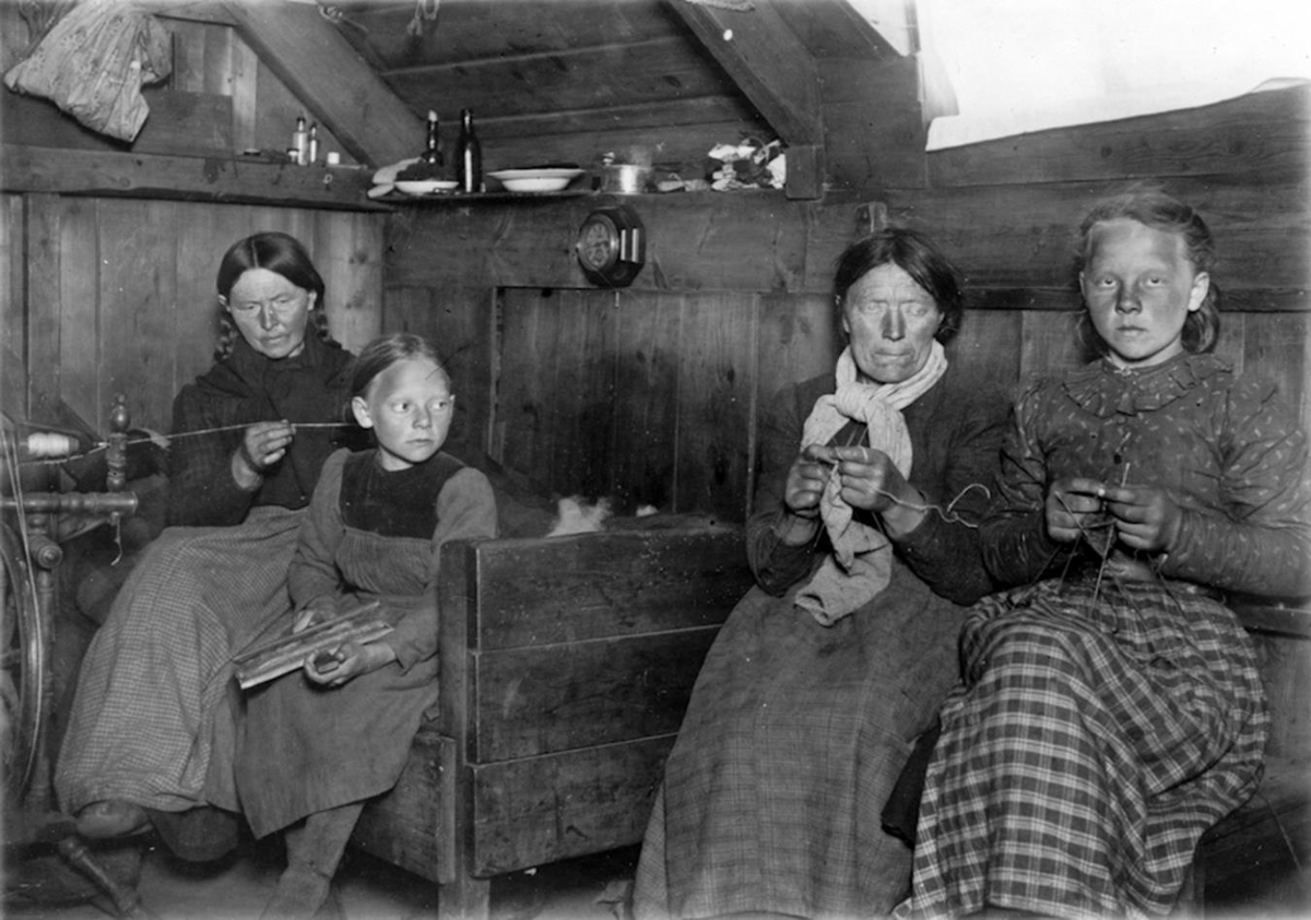 Myndin sýnir fjórar konur sem sitja í baðstofu og vinna handavinnu. Yst t.v. er rokkur og kona á miðjum aldri situr í rúmi við gafl baðstofunnar og spinnur þráð á rokkinn. Við hlið hennar situr telpa og kembir ull. T.h. í mynd sitja tvær konur á kistu og prjóna, sú t.v. er fullorðin en sú t.h. ung, um tvítugt.Baðstofan er timburklædd, klukka hangir yfir rúminu og smáhlutir eru á trébrík.