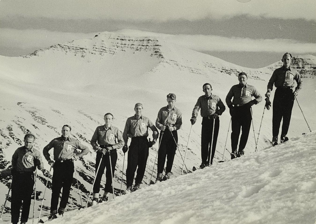 Myndin sýnir hóp skíðamanna standa