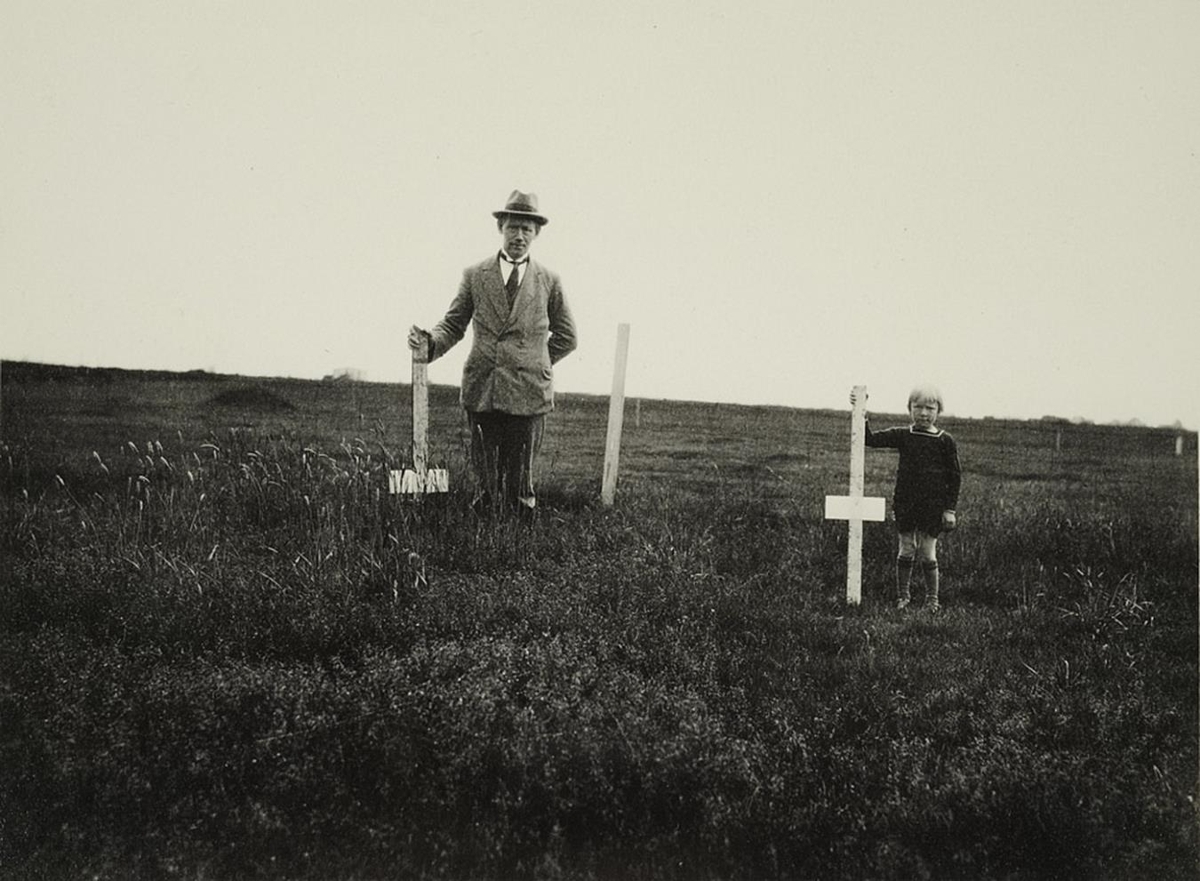 Myndin sýnir fullorðinn karlmann og dreng halda á krosslaga mælistikum á túni.
